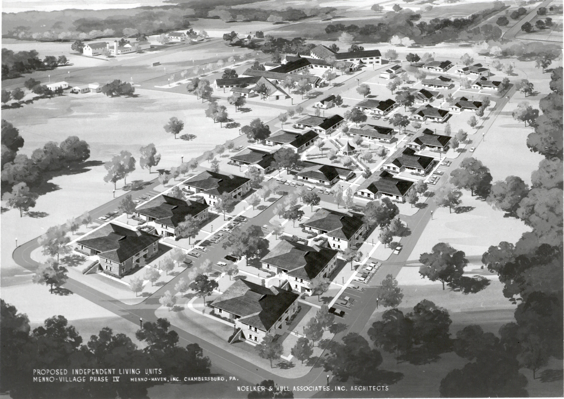 Mr. Noelker and Mr. Hull worked collaboratively designing well-known campuses and structures such as Haven Lutheran Church (Hagerstown, Maryland), Totem Pole Playhouse (Chambersburg, Pennsylvania), James Buchanan High School (Mercersburg, Pennsylvania), Chambersburg Area Middle School (Chambersburg, Pennsylvania), and Menno Haven Senior Living Cottages (Chambersburg, Pennsylvania). Mr. Hull shared some recollections in his notes about Totem Pole Playhouse stating, “One night our good friend Bill Putch (his wife was actress Jean Stapleton) called us at midnight to say an arsonist had set fire to his beloved Totem Pole Theatre. The old wooden structure had burned to the ground. The next day I had lunch with Bill and the President of Totem Pole and by the end of our conversation we had sketched a design for the new theatre at a new location. From that rough design and with the financial support of Noelker & Hull and the community at large, the present Totem Pole Theatre was born. It was constructed and fully furnished and ready for the opening of the summer season in June, six months from the date of the fire.”